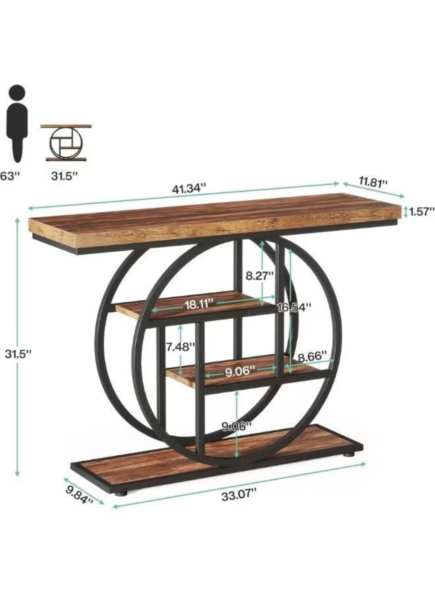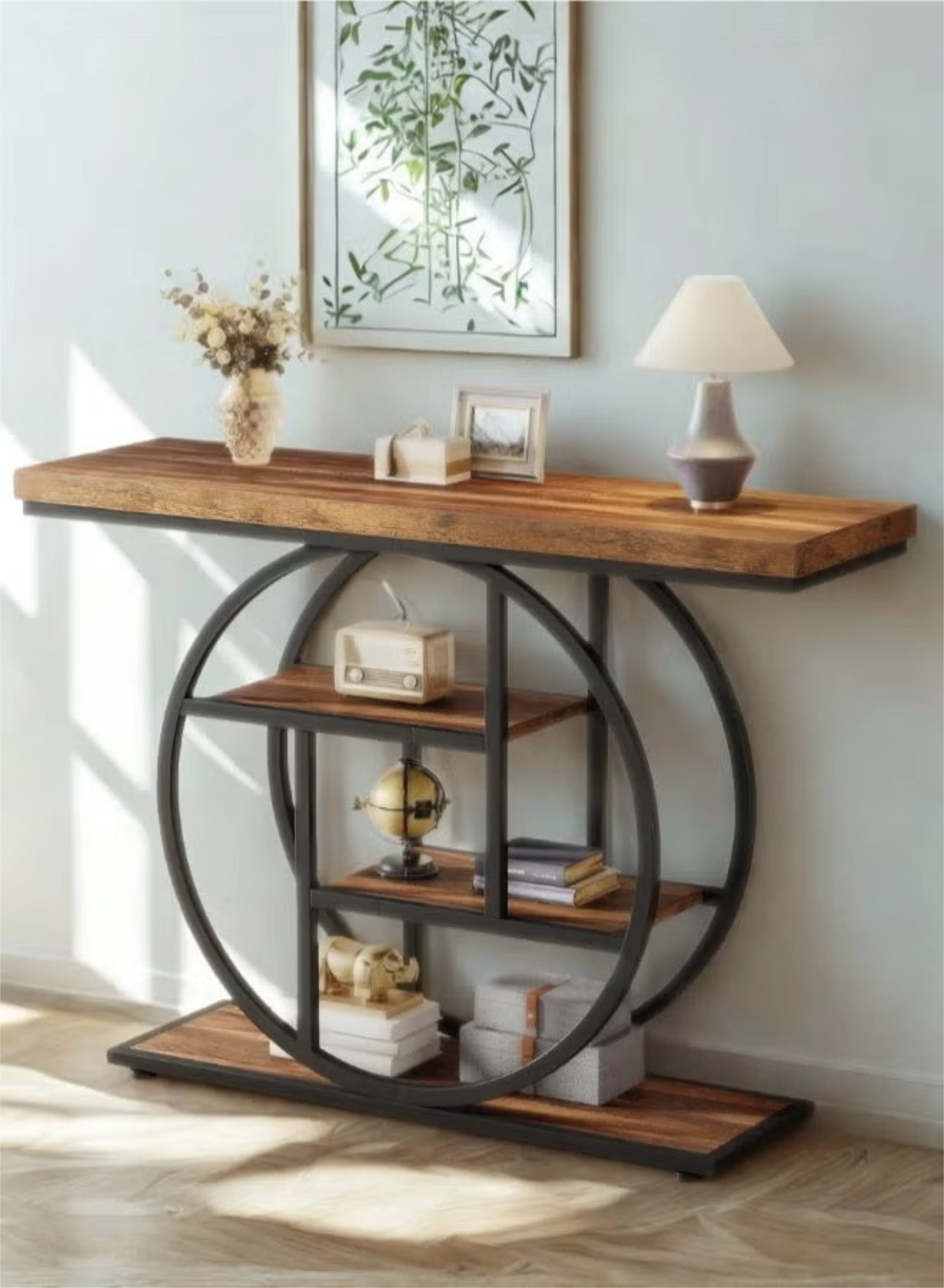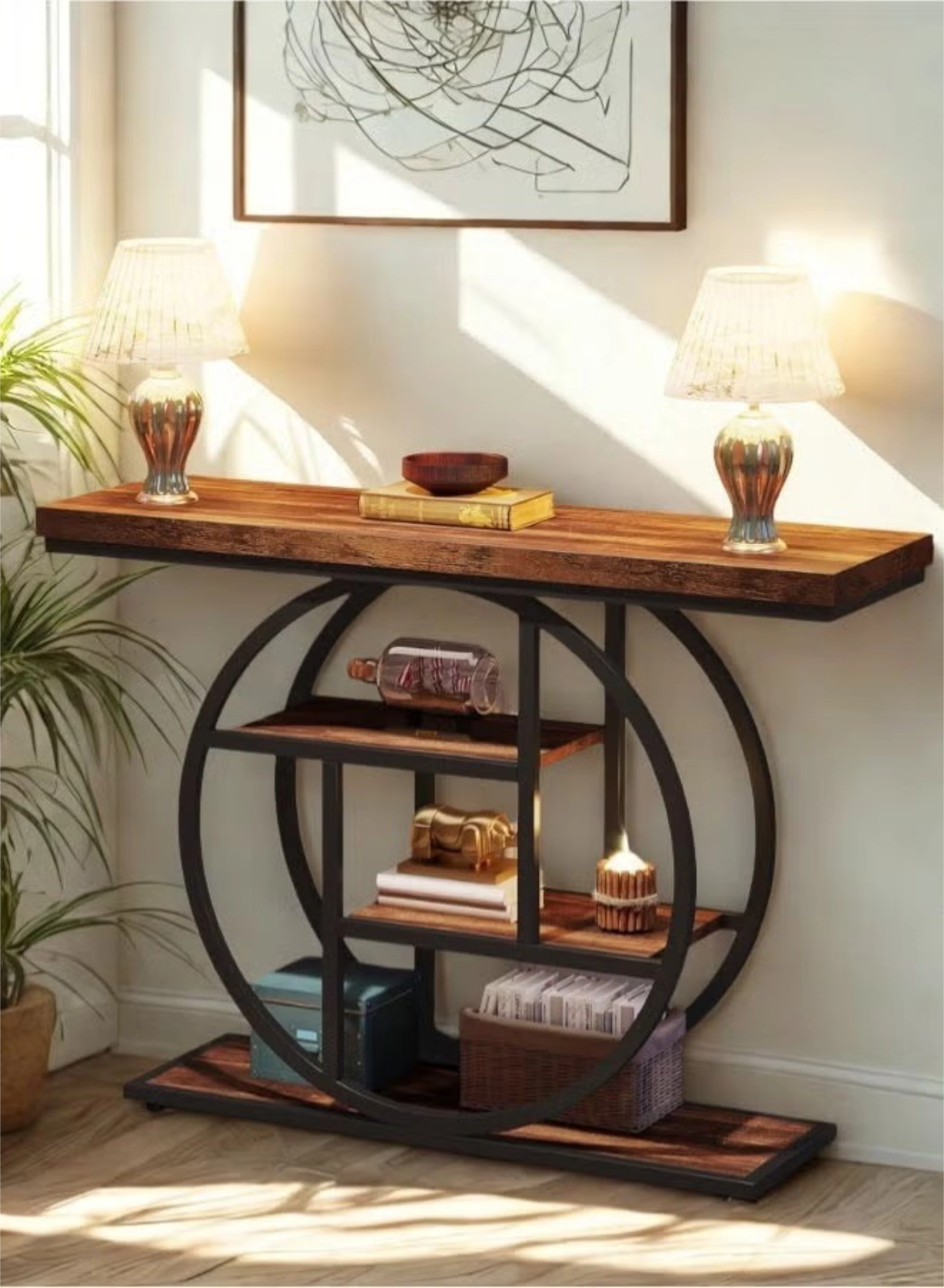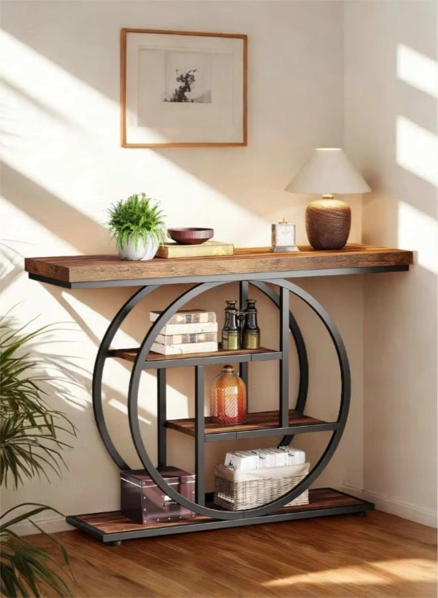This 104.9 cm Industrial console table brings a unique flair to any room with its striking circular geometric metal frame and warm rustic brown finish. It features four staggered tiers of display space, offering both exceptional functionality and aesthetic appeal for your entryway or living room. Built with a robust 3.99 cm thick tabletop and supported by a sturdy metal structure, this versatile piece can hold up to 45.36 kg.