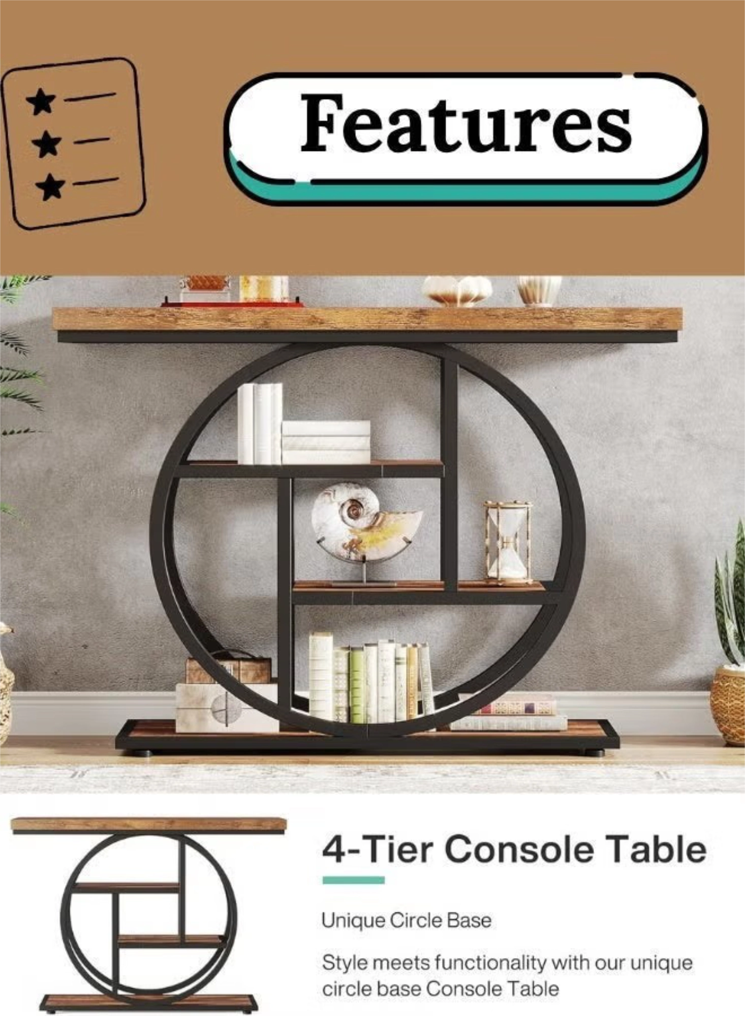 - Unique Circular Design: 104.9 cm wide Industrial console table with a large, eye-catching circular metal base and rustic brown finish.